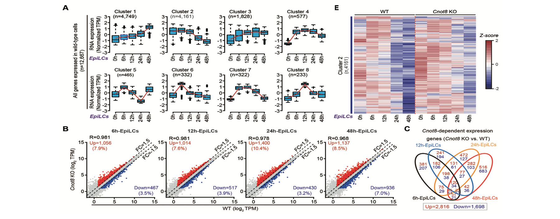 Compared with the cells differentiated from normal ESCs, Cnot8 KO cells highly expressed a great many genes during their differentiation into the formative state,