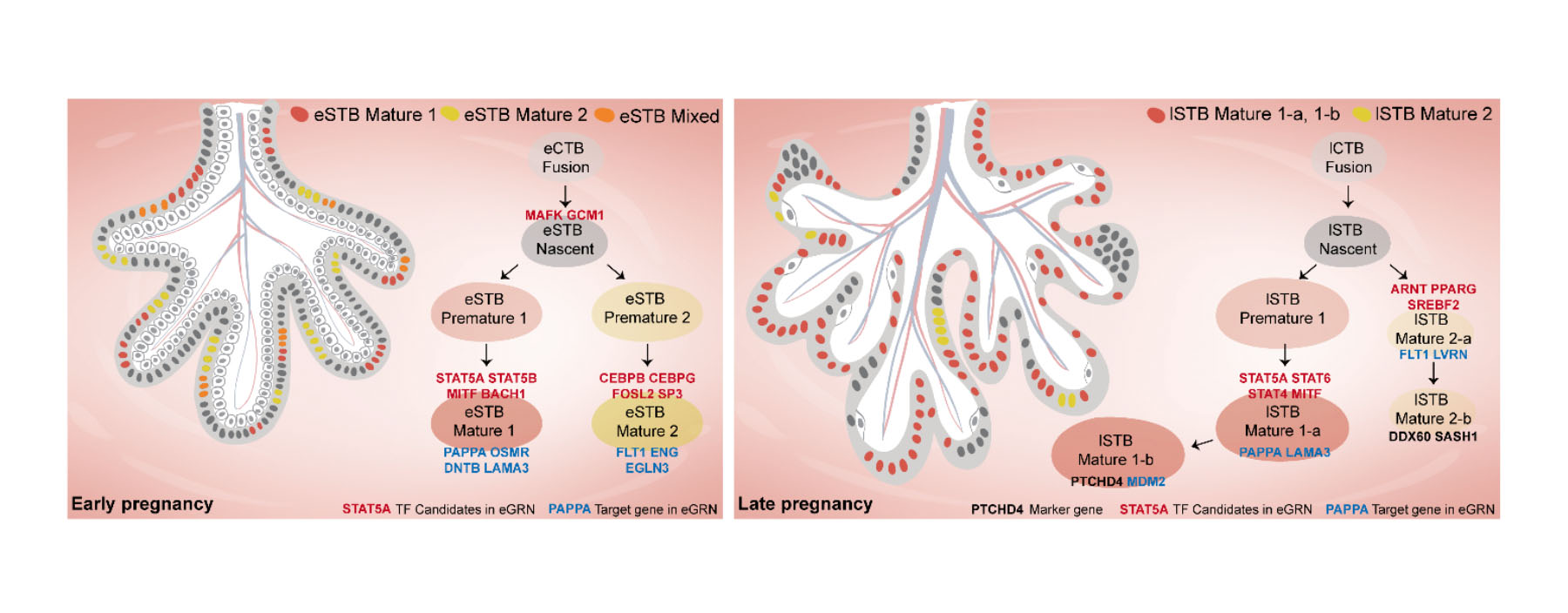 from early and late pregnancy. Our findings demonstrate the dynamic heterogeneity and developmental trajectories of STB nuclei and their correspondence with human